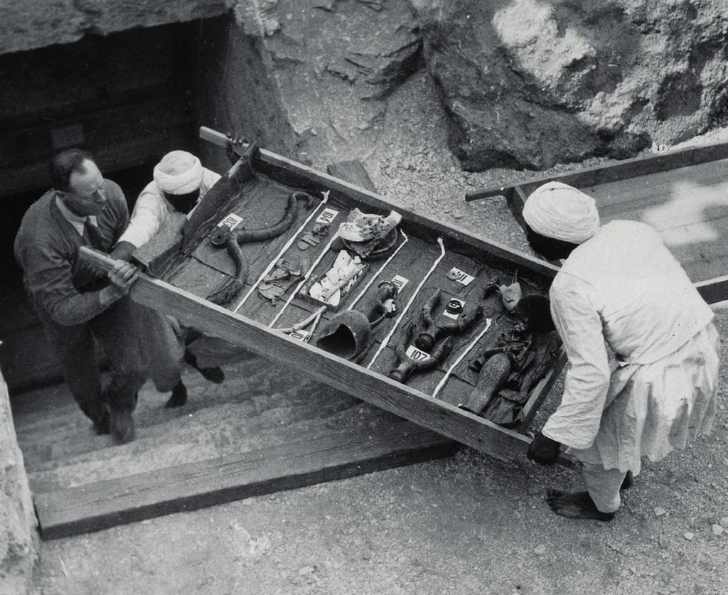 Découverte de la tombe de Toutânkhamon en 1922 : une pièce de chariot est extraite du tombeau. © Bridgeman Images