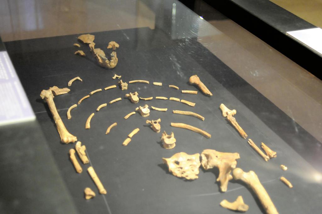 Reconstitution du squelette A. L. 288-1 en position de vie, dans la galerie de paléontologie et de préhistorique du Musée national d’Éthiopie. Les os réellement découverts sont en brun. Photo DR