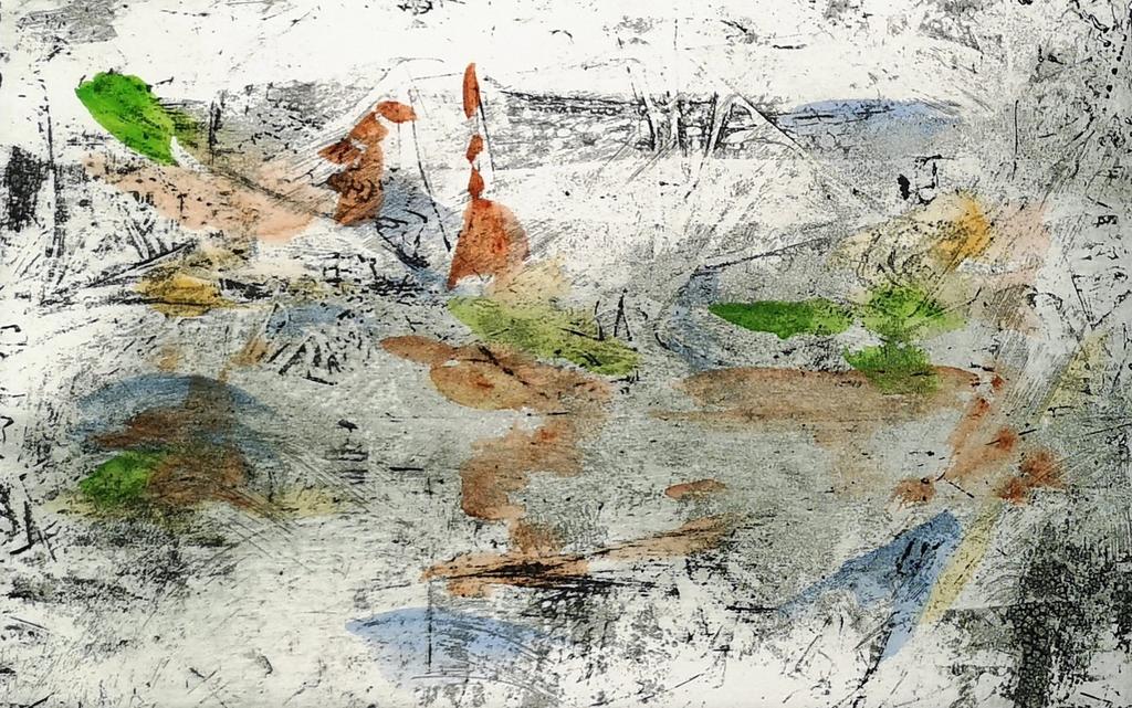Marie Alloy, même si elle a gravé de très beaux portraits de poètes, comme, entre autres, Guillevic ou Abdellatif Laâbi, définit son art graphique plutôt comme abstrait, non pas sur le plan conceptuel mais sur le plan sensible. C’est ce qu’elle nomme l’abstraction « allusive ». À l’instar de nombreux graveurs et graveuses, elle cherche à « être surprise par ce qu’elle fait ». Comme l’écrivait Paul Valéry, « la gravure comporte une surprise […]. Le dessin, à chaque instant est ce qu’il est ; mais la gravure sera ce qu’elle sera. La morsure, le tirage, les reprises, les états successifs introduisent leurs conditions d’indétermination3 ». « Gravures picturales », « poèmes aquarelles » : en brouillant les frontières entre les arts, en jouant avec les genres et les catégories et en inventant de nouvelles correspondances, Marie Alloy s’y entend pour accentuer cette surprise. Sa dernière innovation, la collection « Duo » qui réunit deux artistes et un poète, illustre bien ce goût : le prochain opus, intitulé L’Instant rimbaldien, avec des poèmes inédits de Sylvie Fabre G. et des gravures de Christiane Vielle et Marie Alloy, est annoncé pour 2025. En attendant, plusieurs nouveautés seront présentées au salon Pages, parmi lesquelles La Ligne d’ombre, poèmes et aquarelles de Marie Alloy (Al Manar), Mes mains n’ont rien de Jean-Gabriel Cosculluela ou encore Pour revenir au monde clair, poèmes de Sylvie Fabre G. et gravures de Marie Alloy (Le Silence qui roule).
