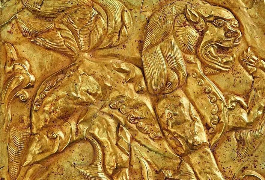 Plaque d’ornement à motif de lion (détail), époque Tang, période Tubo (VIIe-IXe siècle). Argent doré. Xining, musée de la culture médicinale tibétaine du Qinghai. Photo service de presse. © Musée de la culture médicinale tibétaine du Qinghai