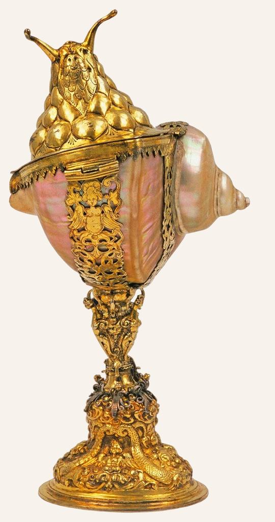 Toute la virtuosité des orfèvres du XVIIe siècle se résume dans ce hanap formé à partir d’un coquillage en nacre. Le couvercle fixé par une charnière figure avec un grand naturalisme la tête du gastéropode, les antennes dressées, sortant de son habitacle. Le pied en argent doré est richement ciselé et sculpté. Ces pièces alliant curiosités et matériaux précieux étaient très à la mode dans les pays germaniques, elles témoignaient de l’engouement des princes pour ces objets d’apparat de grand prix.