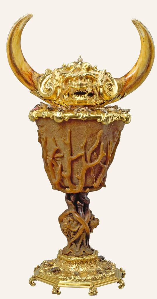 Cette imposante coupe a été sculptée dans une corne de rhinocéros par Nikolaus Pfaff. Sa monture en argent doré est ornée d’araignées, crapauds, millepattes, lézards, serpents symbolisant les forces du mal incarnées par le microcosmos. Le couvercle est surmonté d’une tête démoniaque pourvue de cornes réalisées à partir de défenses de phacochère. Autrefois, une « langue de vipère » façonnée dans une dent de requin fossilisée sortait de sa bouche. La corne de rhinocéros, la langue de vipère et les branches de corail sculptées sur le corps de la coupe étaient supposées avoir des pouvoirs de guérison. Conservée aujourd’hui au Kunsthistorisches Museum de Vienne, cet objet provient du cabinet de curiosités de Rodolphe II (1552-1612) à Prague, kunstkammer la plus célèbre d’Europe à l’époque.
