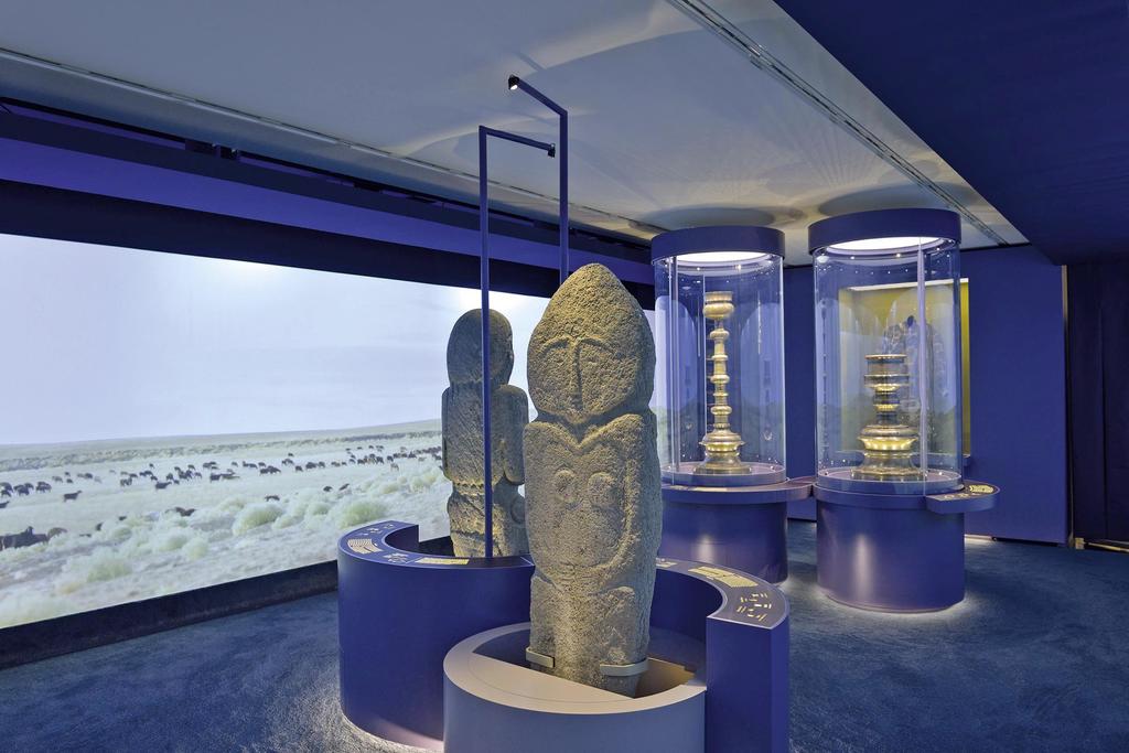 Dans une scénographie immersive qui donne à voir (et à entendre) les paysages des immenses steppes d’Asie centrale, se dévoilent cinq trésors nationaux du Kazakhstan. Remontant au IIIe ou au IIe millénaire avant notre ère, le plus ancien, une bien singulière statue en grès brun soigneusement poli, est surnommé « le Penseur de Tobyl » en référence à l’œuvre de Rodin et au site où elle a été mise au jour. Mais ses larges orbites profondément creusées et tournées vers les cieux lui ont aussi valu le sobriquet de « l’homme scrutant le ciel ». La virtuosité de la sculpture montre autant une profonde connaissance de l’anatomie qu’une volonté de stylisation, dans un rejet délibéré du respect des proportions. Et au-delà, elle témoigne également d’un changement du mode de vie des tribus de chasseurs nomades vers une économie productive reposant désormais sur l’élevage du cheval et des bovins, considérée comme le fondement de la civilisation des steppes.