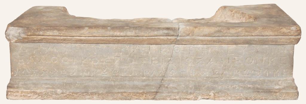 Base portant une dédicace digraphe à Déméter et Corè, grec alphabétique en haut, grec syllabique en-dessous. Kourion, fin du IVe siècle avant notre ère. British Museum, inv. 1896.0201.215. Courtesy of the Trustees of the British Museum.