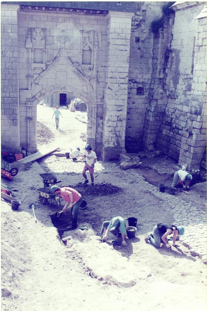 Fouilles de 1995 mettant au jour la voie moderne menant à la « porte d’en bas », accès monumental à la clôture des religieuses. Coll. Abbaye de Fontevraud. © Jean Poulain CCO