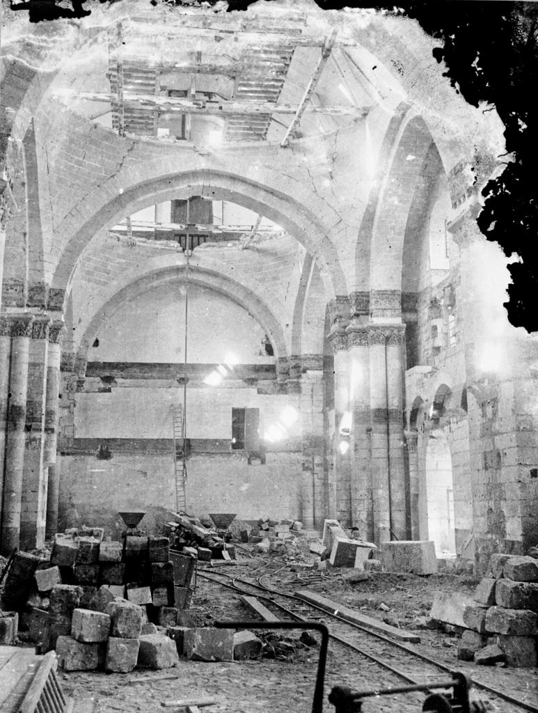 Intérieur de l’église abbatiale libérée de ses planchers pénitentiaires lors de sa restauration au début du XXe siècle. Les coupoles détruites pour y aménager des dortoirs sont reconstruites lors de cette opération. Coll. archives départementales de Maine-et-Loire. © Région Pays de la Loire, inventaire général