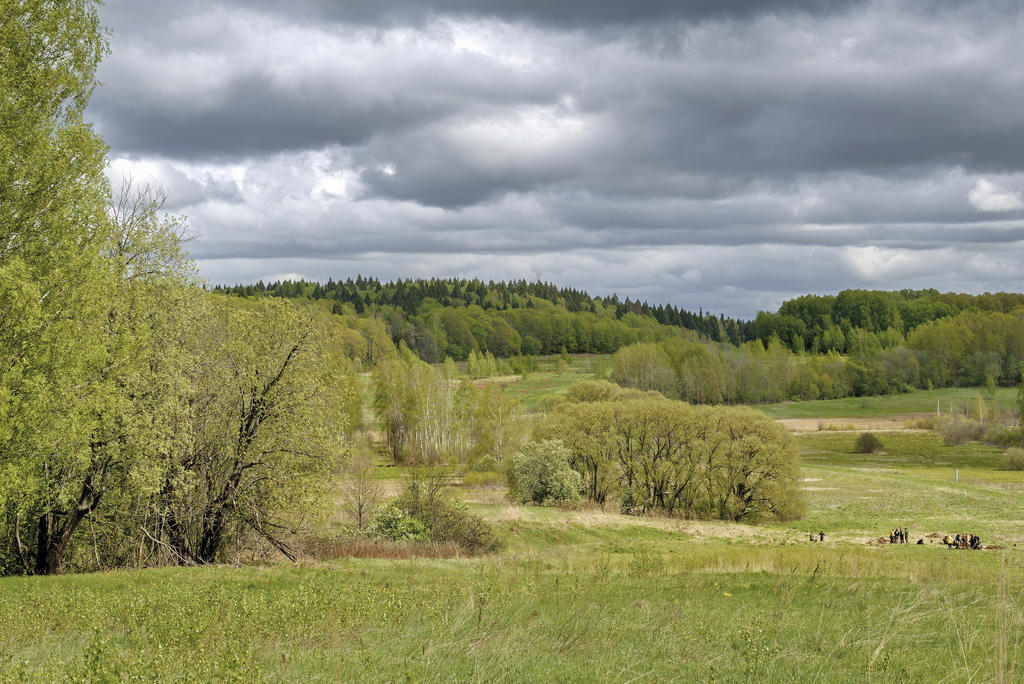 Champ de bataille de Valoutina Gora montrant l’équipe sur le lieu où le général Gudin a été fauché par un boulet. © F. Lemaire, photo D. Bossut, Inrap