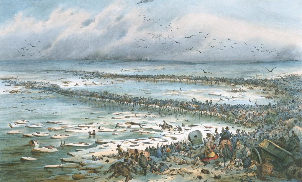 Le Passage de la Bérézina en 1812. V. Adam, lithographie couleur. © Brown University Library, Bridgeman Images