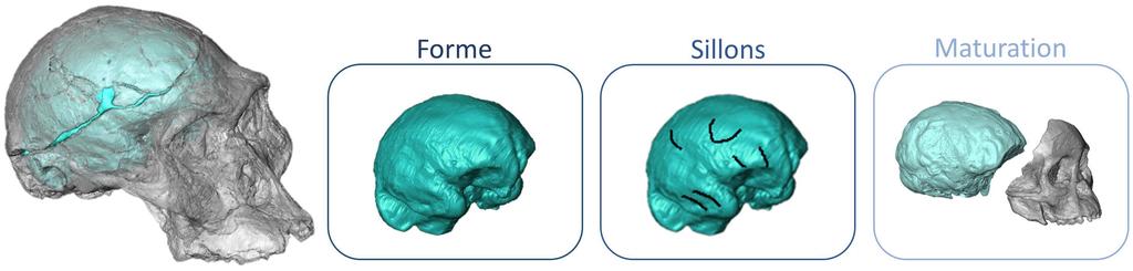 La comparaison du cerveau humain actuel avec celui des chimpanzés révèle une série de caractères propres au nôtre, comme une forme arrondie, une aire visuelle réduite, la présence de deux sillons dans la région de Broca ou encore une longue période de maturation après la naissance. Ces traits sont probablement à l’origine de comportements uniques, comme la fabrication d’outils ou le langage, en partie responsables de notre succès évolutif. Ces spécificités étaient-elles déjà présentes chez A. afarensis ? La réponse à cette question est loin d’être évidente en raison des problèmes pratiques qu’elle soulève. En l’absence de tissus mous, le cerveau des espèces fossiles est reconstruit à partir des empreintes qu’il laisse sur la surface interne de la boîte crânienne. En conséquence, seul l’aspect externe du cerveau, et donc sa forme ainsi que l’organisation des sillons cérébraux, est enregistré. Par ailleurs, nous disposons essentiellement de fragments d’os et de très peu de crânes complets d’A. afarensis, et plus largement d’Australopithecus. Néanmoins, en recoupant les informations disponibles pour l’ensemble de ce genre, les paléontologues ont établi que le cerveau de Lucy et des siens était relativement allongé, comme celui des chimpanzés actuels, et que l’aire de Broca ne montrait qu’un seul sillon.