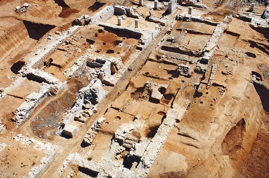 Vue de la fouille du corps central du château de Roissy, été 1999. Les murs les plus visibles sont ceux des XVIIᵉ et XVIIIᵉ siècles. Les zones les plus sombres correspondent au sol de l’occupation médiévale. © Y. Franzini (Inrap)