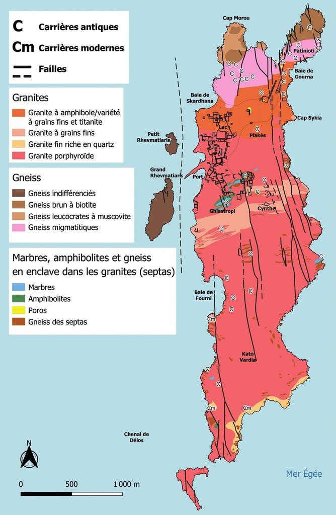 Carte géologique de Délos avec emplacement des carrières. © ANR-GAD