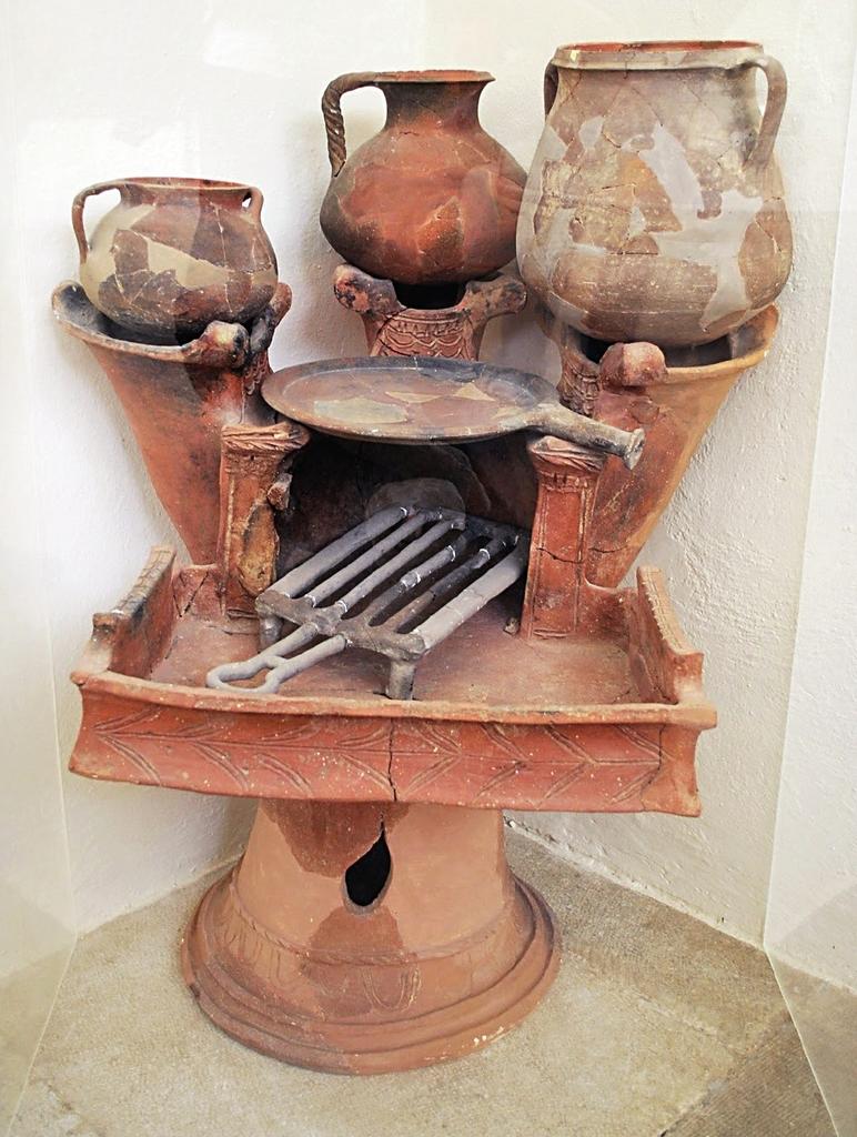 Réchaud de type Bakalakis et vases culinaires, musée de Délos. © EFA