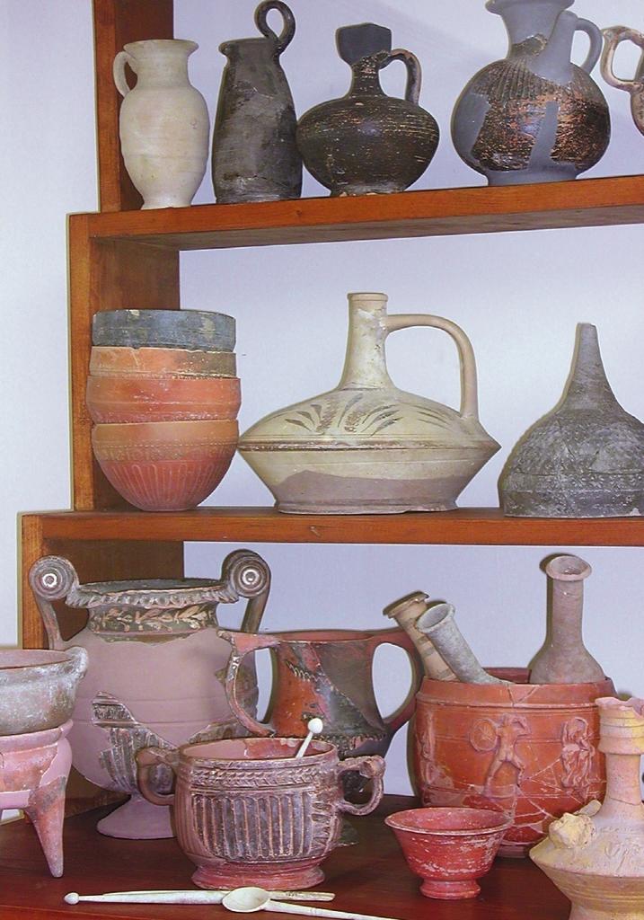 Les esclaves cuisiniers utilisent des mortiers et pilons en pierre pour moudre, concasser et mélanger ou en céramique à bec verseur pour faire tremper et ramollir céréales et légumineuses. La bouilloire, pourvue d’un filtre sur le bec pincé, est dédiée à la ptisane (décoction de grains d’orge mondés), parfois aromatisée de vin, d’huile d’olive ou de lait. D’autres vases à filtre, à col en entonnoir et bec tubulaire, conditionnent divers liquides (vinaigre, vin, huile, lait, miel, oxymel – vinaigre et miel – ou melicraton – lait et miel) et facilitent leur transvasement. Ils permettent aussi d’égoutter des denrées en saumure ou en sirop et d’en récupérer le bain. D’autres ustensiles, kyathos pour mesurer et puiser, passoire, entonnoir et vases culinaires, destinés à chauffer les aliments, sont cantonnés à la cuisine. La prépondérance de la chytra pour les soupes, purées et bouillies (céréales, pois chiches, fèves, lentilles) et de la caccabè (marmite) pour mijoter des ragoûts, s’estompe au cours du IIe siècle avant notre ère. Elles sont concurrencées par la lopas (casserole), qui braise ou cuit à l’étouffée poissons et légumes, le tagenon (poêle) pour frire ou griller, et la patina, plat importé d’Italie. Posée sur une sole chaude et fermée par un couvercle recouvert de braises (pnigeus ou testum), cette dernière contient une recette romaine, à base de poisson, légumes ou fruits, assaisonnés avec des épices, du miel, du garum (sauce fermentée typiquement romaine à base de poisson) ou du vin, et noyés dans des œufs battus.