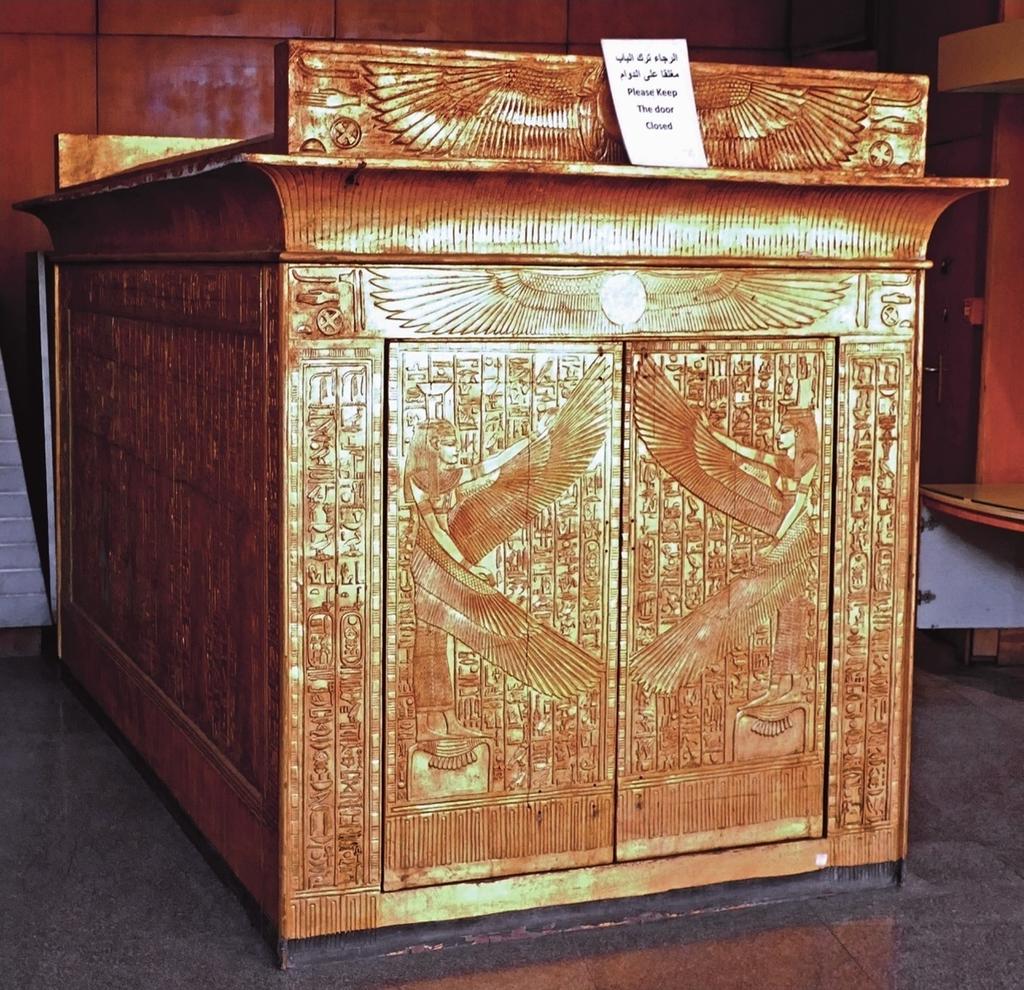 Dans la chambre funéraire, le corps de Toutânkhamon était protégé par quatre chapelles en bois doré contenant un sarcophage en pierre et trois cercueils en bois.