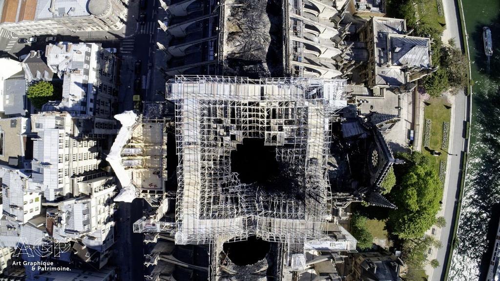 Vue aérienne de Notre-Dame. Détail des échafaudages installés à la croisée du transept. © Art graphique & patrimoine