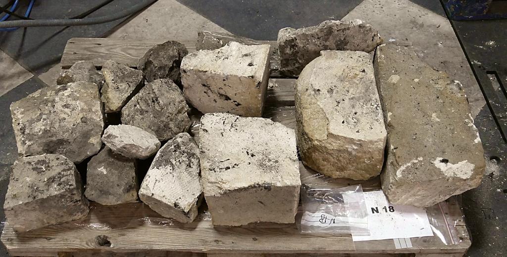 Classement sur les palettes des pierres récupérées et étiquetées par godet. © Marc Viré, Inrap