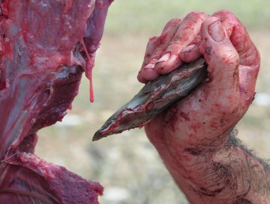 Expérimentation de découpe de la viande à l’aide d’un outil de pierre (biface). © Ruth Blasco