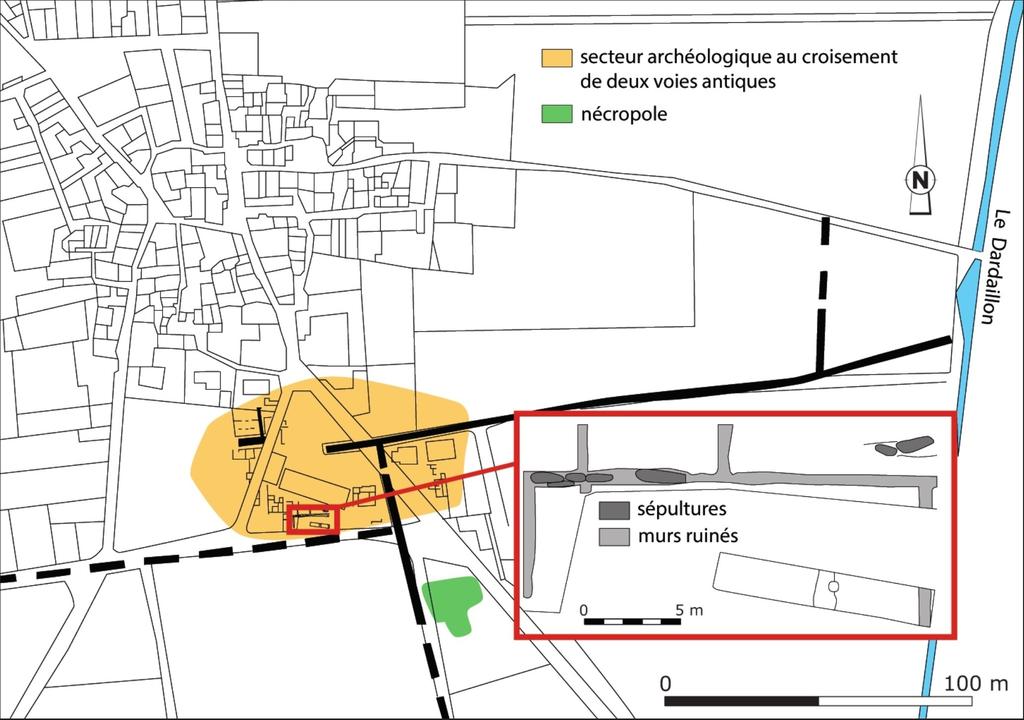 Ce groupe funéraire, que les datations au carbone 14 situent essentiellement dans la seconde moitié du VIe siècle, témoigne de l’enterrement anormal d’un groupe de défunts auxquels l’accès au cimetière contemporain, pourtant tout proche, a été refusé. Et plutôt que de funérailles ou de sépultures, on est enclin à parler d’enfouissements, les corps ayant été hâtivement recouverts de gravats avant que n’intervienne le comblement des tranchées, sans qu’aucune couverture ne protège les corps. Que penser de cette forme d’exclusion et du statut du groupe inhumé dans d’aussi singulières conditions ? S’agissait-il d’une frange servile ou déshéritée de la population ? De malfaiteurs ou d’indésirables discrètement escamotés ? D’étrangers morts accidentellement ou éliminés ? Ou de malades contagieux ?