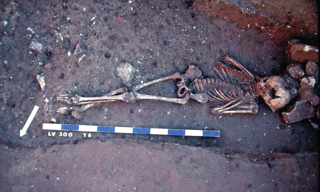 Sujets pestiférés déposés dans une tranchée d’empierrement d’une habitation gallo‑romaine de Lunel‑Vieil. Datation radiocarbone 560‑600. © C. Raynaud
