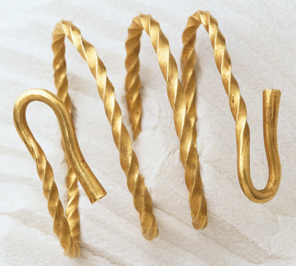 Torque torsadé en or dit « de Toulouse ». Âge du bronze final, 7 x 8 x 0,4 cm replié. © J.-F. Peiré, musée Saint-Raymond de Toulouse