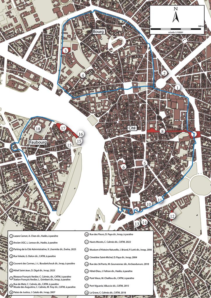 Les opérations dans le quartier du bourg Saint-Sernin sont peu nombreuses (voir plan page suivante). Récemment deux d’entre elles se sont tenues à l’extérieur de la ville médiévale, à proximité du rempart. Elles ont mis en valeur l’existence d’un cimetière, peut-être en lien avec l’épidémie de peste du XIVe siècle et, près d’une porte, un long bâtiment, assez atypique, à la fonction encore indéterminée. Mais ce sont surtout les recherches localisées dans le bourg qui ont livré de nouvelles informations. Ainsi les fouilles de l’ancien arsenal ont révélé l’existence, contre l’enceinte, d’un ancien quartier de la fin du Moyen Âge. Ses maisons ont ensuite été méticuleusement arasées par les Chartreux, qui l’ont, à la période moderne, transformé en jardins. Enfin, à moins d’une centaine de mètres au sud, un suivi archéologique a cerné un îlot bâti d’époque moderne le long de la rue Valade.