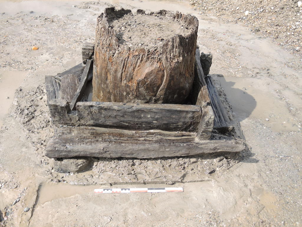 Vue du cuvelage en chêne du puits ST 218 d’Erstein (Bas-Rhin). L’analyse a révélé que les dates d’abattage des bois s’échelonnaient sur près de deux siècles, entre 1743 et 1562 (+/- 10 ans) avant notre ère. © N. Steiner, Archéologie Alsace
