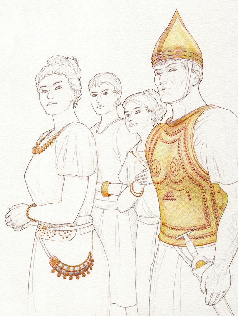 Évocation des élites du bronze final,vers 1300‑1200 avant notre ère dans le sud-est du Bassin parisien. © Département de Seine-et-Marne, dessin P.-Y. Videlier, atelier Scène de Papier