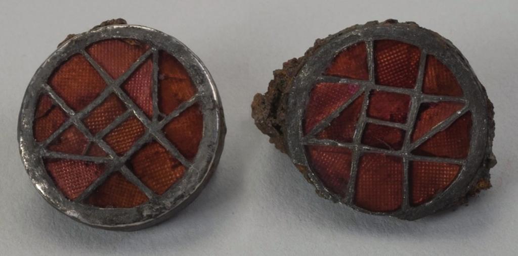 Fibules discoïdes à décor cloisonné de grenats provenant de la sépulture 12 de Saint‑Dizier, « La Tuilerie », en Haute‑Marne. © C. Philippot, Collection du musée de Saint‑Dizier ; responsable de la fouille M.‑C. Truc, Inrap