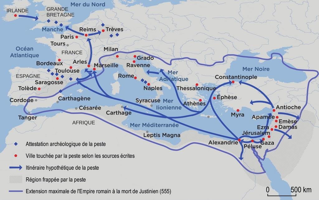 Carte de diffusion de la pandémie de Justinien. © Frédéric Barenghi, Inrap