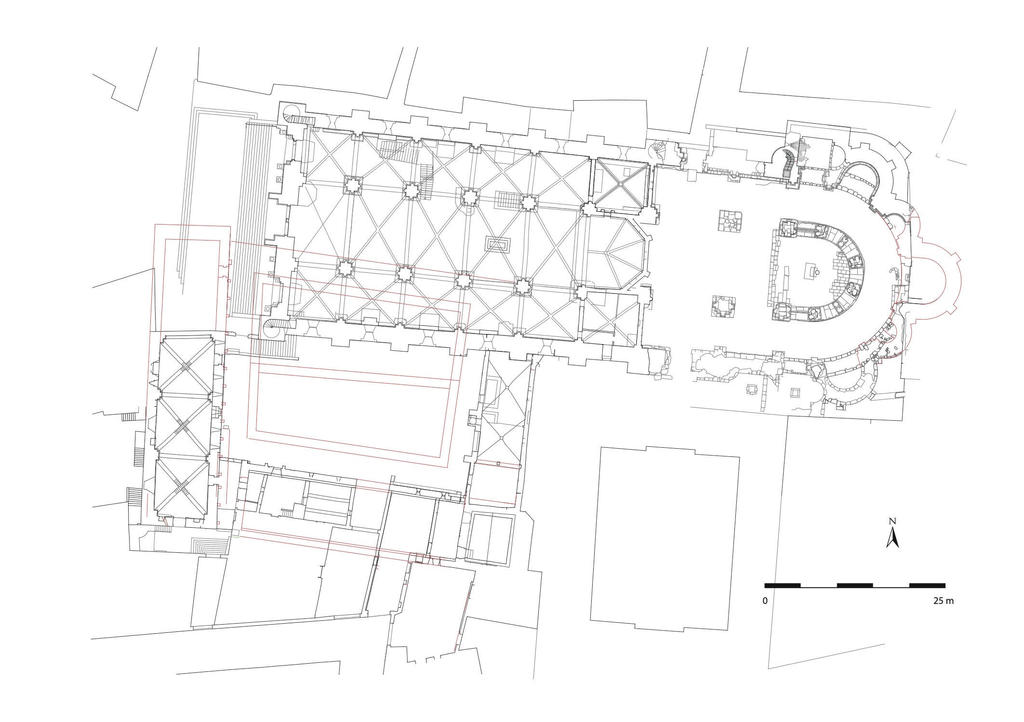 Projection du plan de l’ancien cloître en rouge par rapport aux bâtiments actuels. © H. Hansen, UMR7598 LA3M, Aix-en-Provence