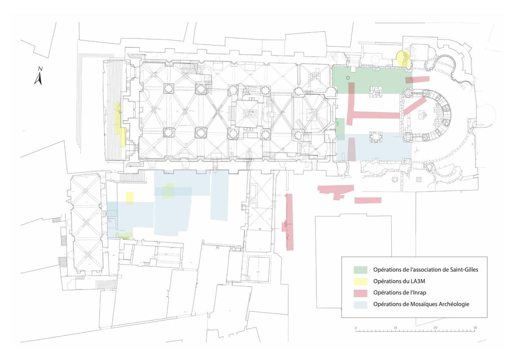 Plan des différentes interventions archéologiques menées à l’abbaye de Saint-Gilles.