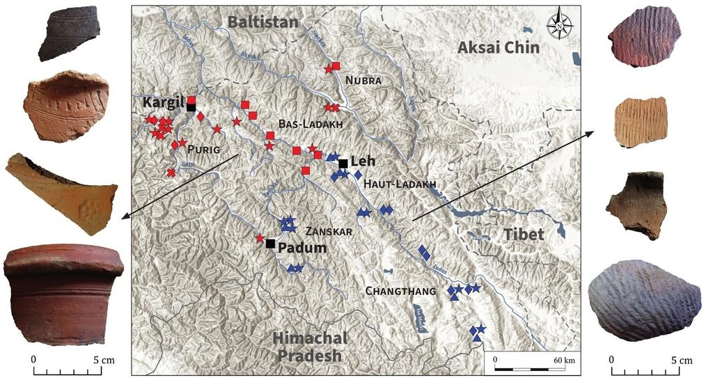 D’autre part, les régions méridionales sont marquées par des interactions avec l’ouest tibétain et himalayen. Ce phénomène est visible sur les céramiques et les villages fortifiés. Les premières se caractérisent par un façonnage utilisant battoir cordé et contre-battoir qui laissent des empreintes de corde à l’extérieur, et parfois à l’intérieur, des récipients. Cette technique est répandue dans une vaste zone himalayenne et tibétaine, allant du Ladakh au Mustang (Népal), en passant par le Ngari (Tibet), la vallée de Spiti, le Kinnaur et l’Uttarakhand (Inde). Au Ladakh toutefois, ces céramiques ont été découvertes dans des villages fortifiés, aux pièces contiguës construites en pierres sèches formant le rempart du site lui-même, et dans des dépressions circulaires (possiblement des sites funéraires), alors que dans le reste de l’ouest himalayen, elles sont uniquement issues de contexte funéraire.