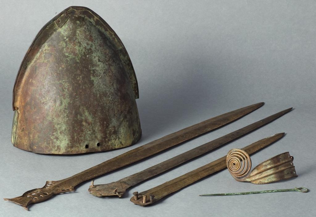 Ensemble d’objets prestigieux de l’âge du Bronze (casque, épées, parures) découverts dans la Saône au cours de dragages sur l’ancien passage à gué de Seurre. © Musée Vivant Denon, Chalon-sur-Saône, Jérôme Beg