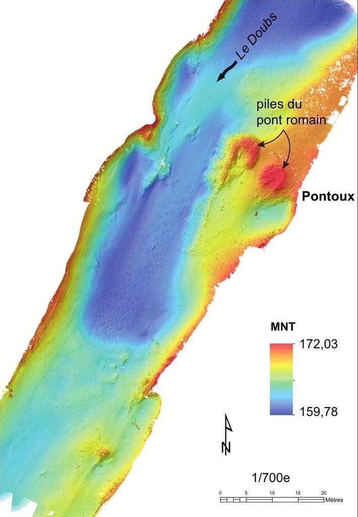 Relevé bathymétrique effectué en 2019 sur la portion du Doubs où se trouvent les vestiges du pont romain de Pontoux. Le chenal creusé par les dragues dans les années 1960 apparaît en bleu foncé ; les vestiges qui ont échappé à la destruction ressortent dans les tons jaunes et rouges. Traitement J. Desmeules et P. Moyat.