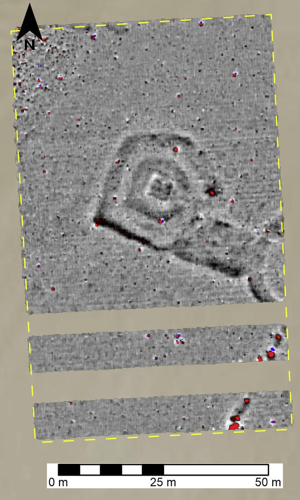 Prospection magnétique de la construction carrée entourée de fossés au nord-est. © G. Bruniaux, Archeosolution