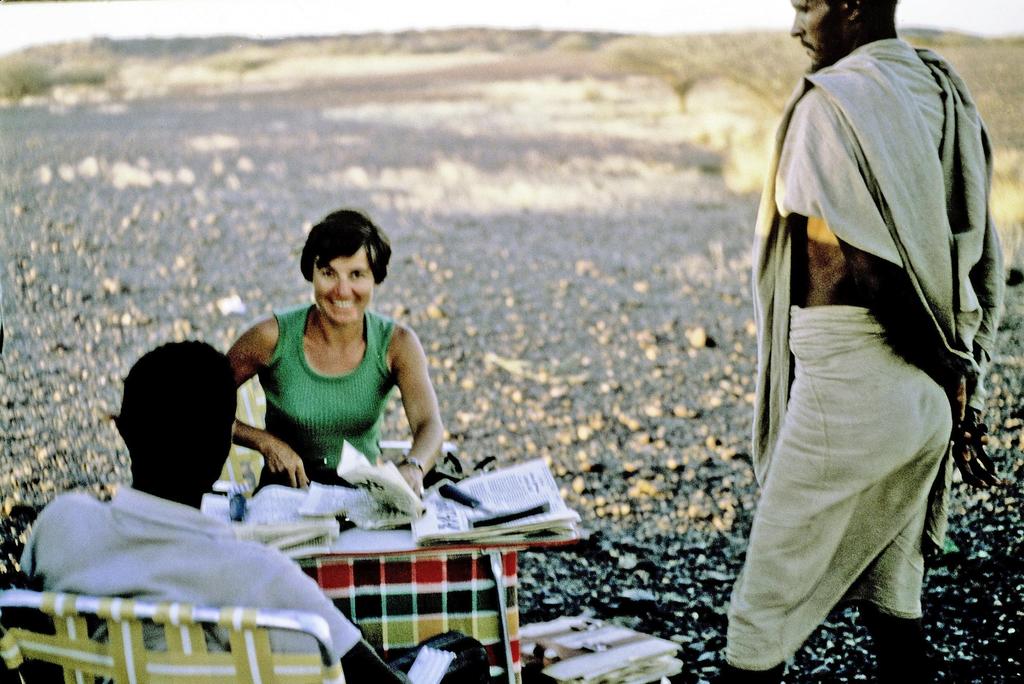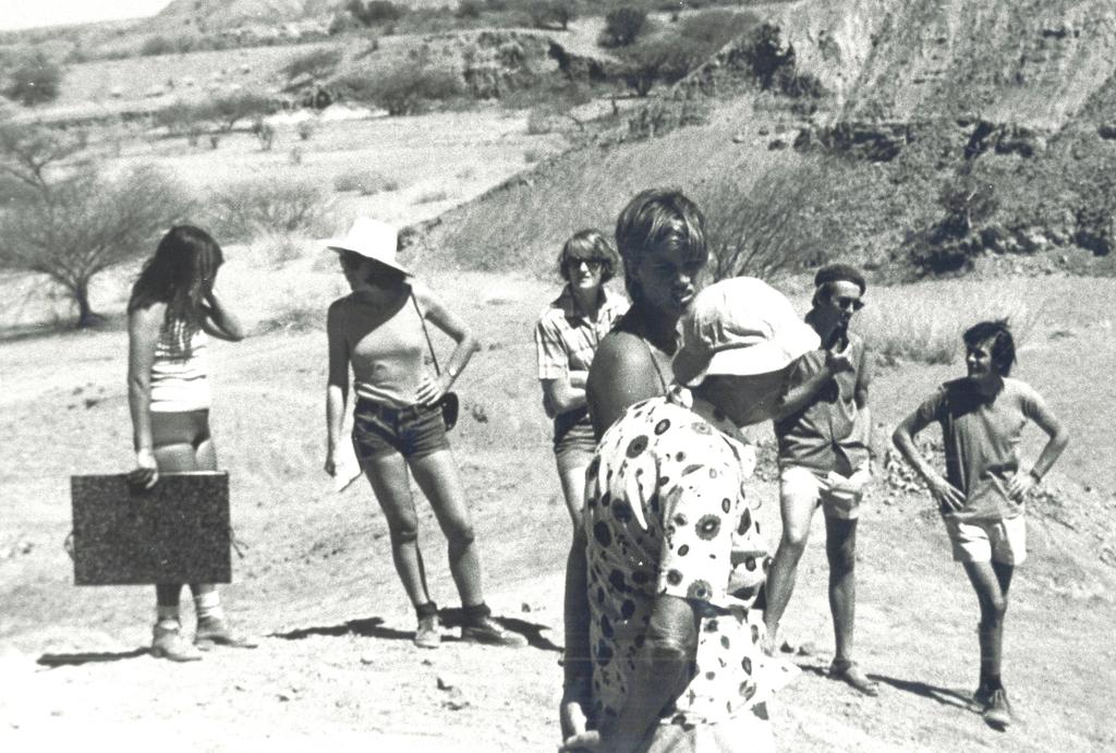 Hadar, 23 novembre 1974, visite de la famille Leakey, la veille de la découverte de Lucy. Au premier plan Mary Leakey ; de gauche à droite : N. Page, Raymonde Bonnefille (chapeau), Meave Leakey, R. Leakey et John Harris. © R. Bonnefille