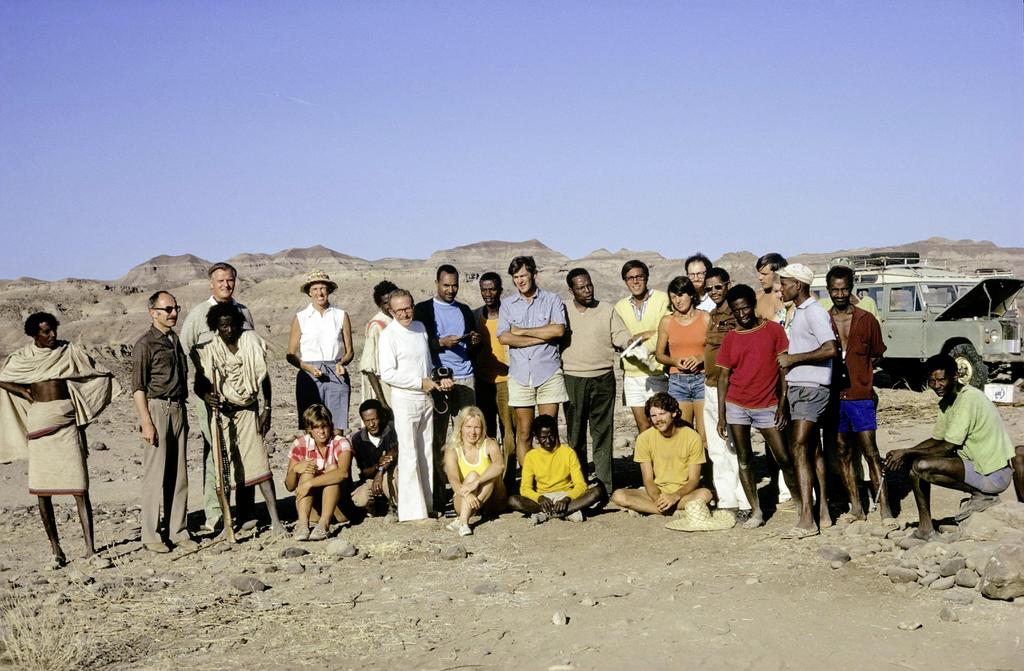 Hadar, 1974, photo de groupe, trois jours après la découverte de Lucy. Visite de Jean Chavaillon, debout en blanc. © R. Bonnefille
