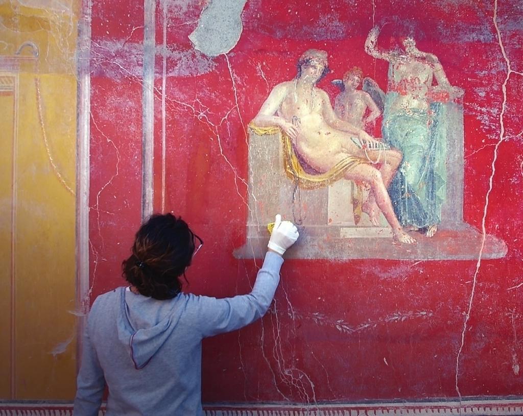 La ruelle qui bordait ces demeures a également fait l’objet d’investigations. Sa stratigraphie intacte conservait le squelette d’un homme qui essayait peut-être de fuir, avec sa bourse en cuir remplie de pièces en bronze et en argent. Sur les pans des murs extérieurs des maisons, des inscriptions vantaient les mérites des candidats locaux en vue d’élections à venir. Au bout de la rue, une petite place en travaux, avec sa fontaine publique reliée à une citerne, était occupée par un thermopolium, un petit restaurant. Ont surgi des décombres de grandes amphores de stockage de vin et des fresques ornant les murs et le comptoir de cet établissement.