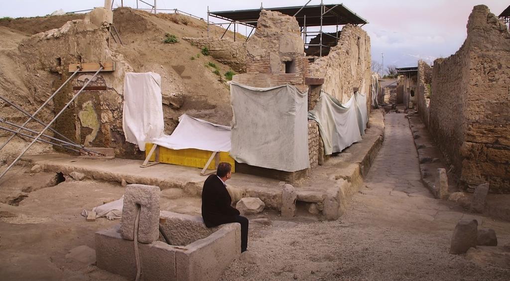 Vue de la rue aux balcons après les fouilles. M. Osanna est assis sur la petite fontaine. Pompéi, Parc archéologique de Pompéi. © GÉDÉON Programmes