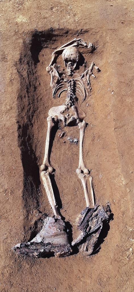Squelette d’un soldat allemand mort au combat et enseveli (face contre terre) sur le champ de bataille, découvert lors de la fouille d’un habitat de l’âge du Fer à Maltot, au sud-ouest de Caen, au pied de la « Cote 112 ». © Vincent Carpentier, Inrap