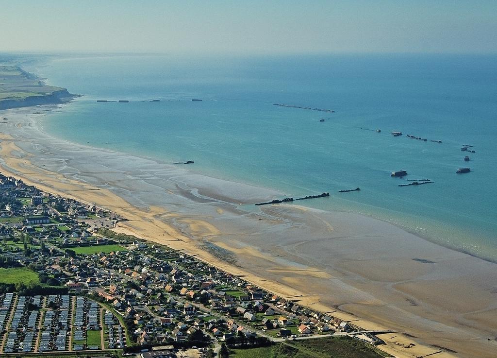 Vue aérienne des vestiges du port artificiel Mulberry B à Arromanches (Calvados), encore partiellement visibles. Il a été assemblé sur place par des ingénieurs militaires britanniques à partir d’éléments préfabriqués dès le soir du 6 juin 1944. Destiné à l’acheminement des armées et du matériel alliés, il reste en service jusqu’au 19 novembre 1944, assurant chaque jour le débarquement de 10 000 à 20 000 tonnes de matériel. © Hervé Paitier, Inrap