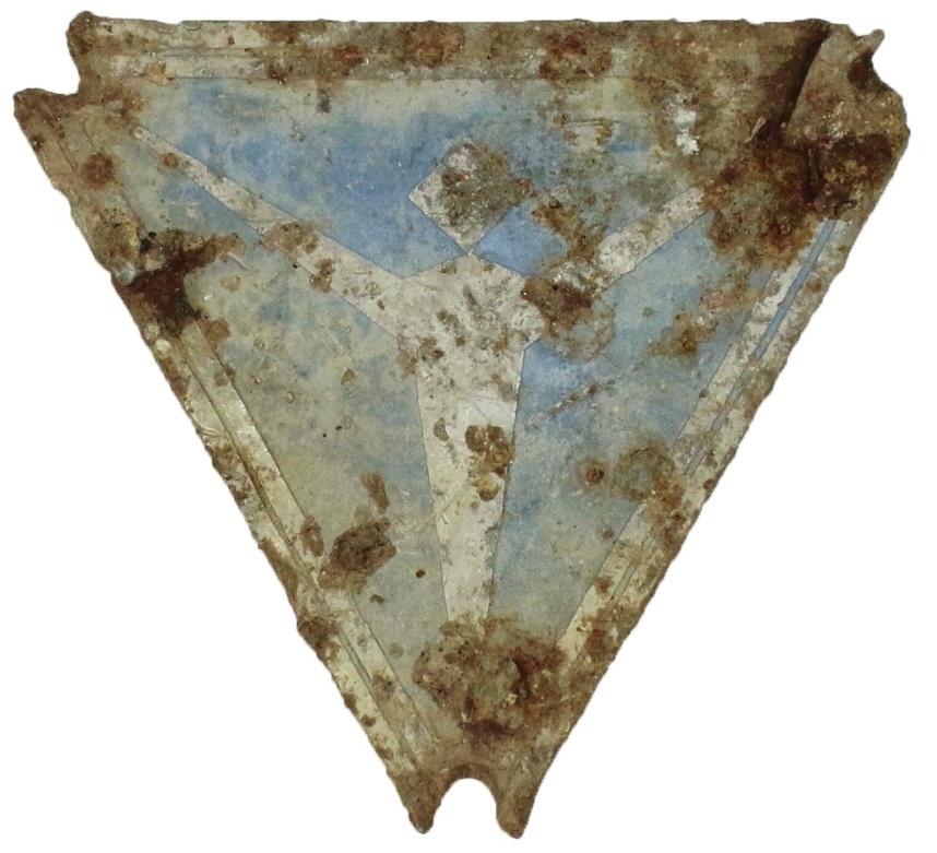 Plaque en aluminium de la firme aéronautique allemande Junkers découverte au sein de la carrière du camp lors de la campagne programmée de 2022. © J. Brangé