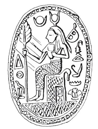Une déesse de type hathorique (la Baalat Gubal ?) est entourée de pseudo-hiéroglyphes, figurée sur un scarabée en jaspe vert. Le type de la hache fenestrée dans sa main, porté encore par des divinités puniques, illustre le transfert ininterrompu de motifs paléo-phéniciens au Ier millénaire avant notre ère. Liban ? Entre le milieu du IXe et le début du VIIe siècle avant notre ère. Hambourg, Museum für Kunst und Gerwerbe 1964.324-1. E. Gubel
