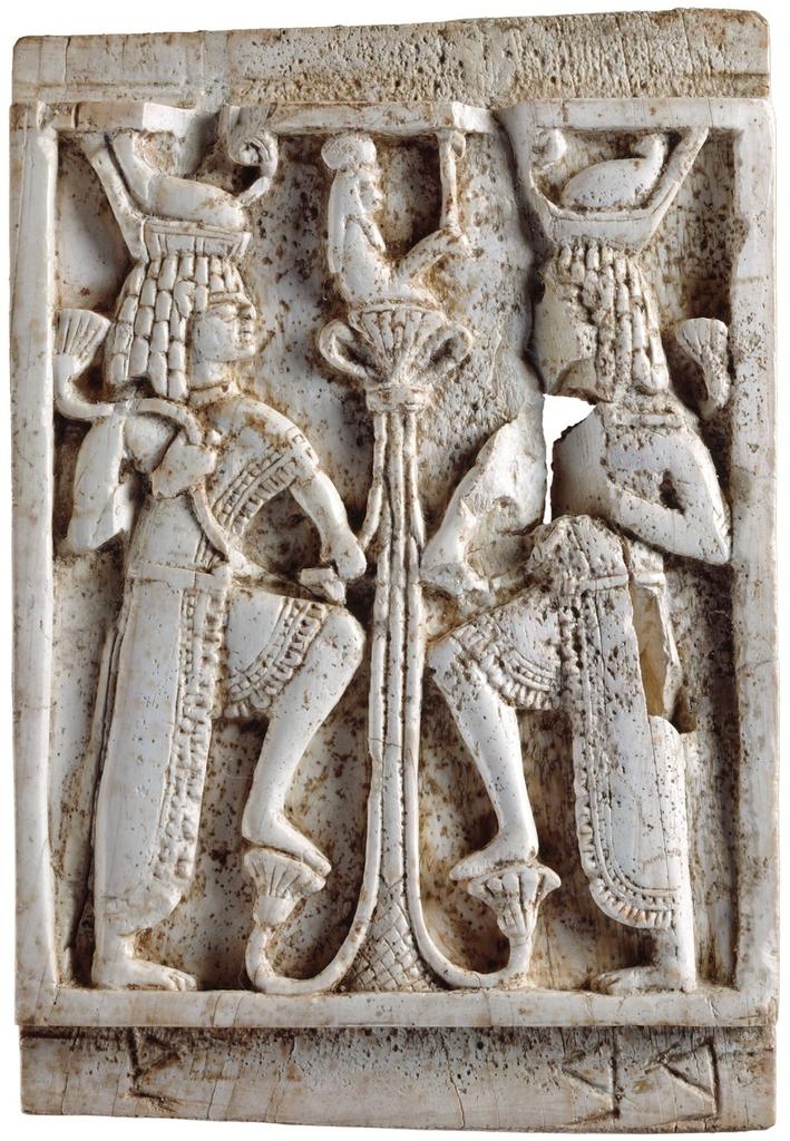 L’unification de la Basse et de la Haute-Égypte rendue par l’enchevêtrement de leurs plantes héraldiques, semble, au premier abord, dénuée de tout sens. Mais c’est oublier la familiarité avec sa signification au Levant du IIe millénaire, et méconnaître le choix judicieux de la reprise éphémère du même motif à une époque où Sidon et Tyr formaient une entité bicéphale du point de vue politique. Plaquette d’ivoire d’Arslan-Tash, IXe siècle avant notre ère. Paris, musée du Louvre. © Musée du Louvre, Dist. RMN-Grand Palais / Raphaël Chipault