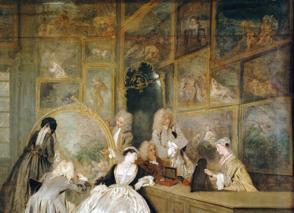 Antoine Watteau, L’Enseigne, dit aussi L’Enseigne de Gersaint (détail), 1720. Huile sur toile, 163 x 308 cm. Berlin, Stiftung Preussische Schlösser und Gärten, Schloss Charlottenburg. © BPK, Berlin, dist. RMN – J. P. Anders