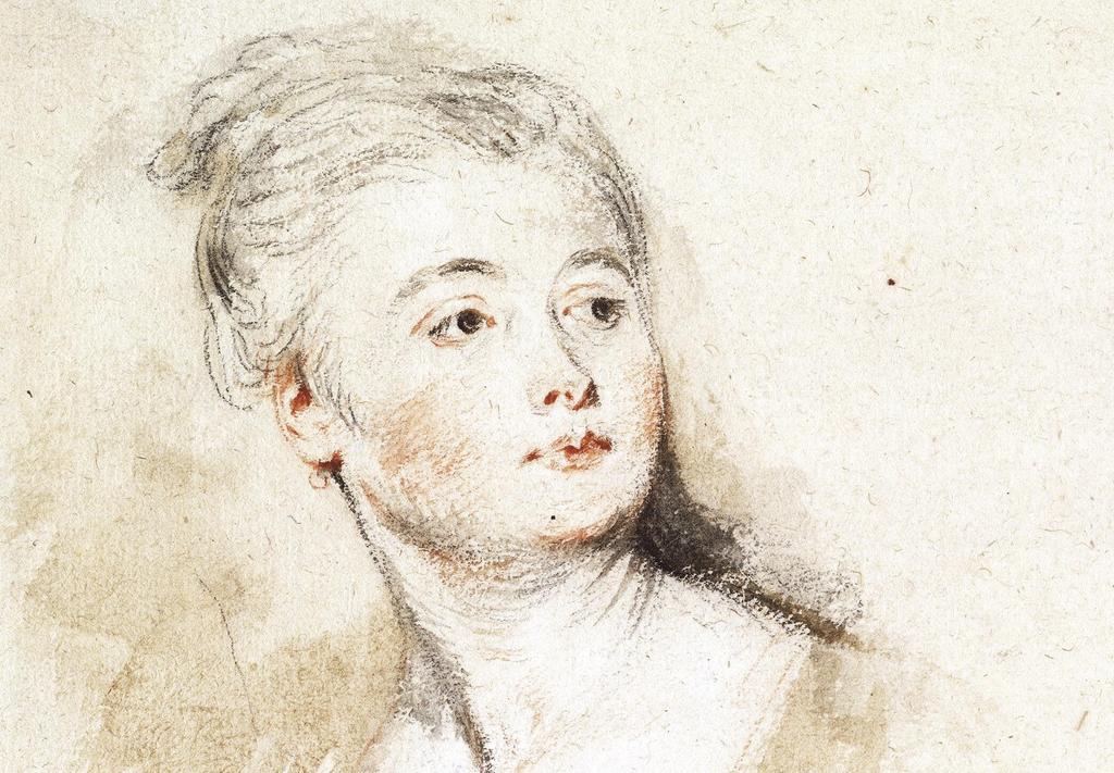 Antoine Watteau, Étude de tête de femme (détail), vers 1718-1719. Trois crayons, pinceau, lavis brun, gris et sanguine, 26,3 x 34,5 cm. Haarlem, Teylers Museum. Photo Collection Teylers Museum
