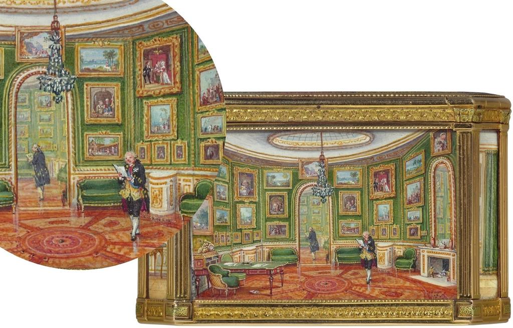 « Dans sa monture “à cage” sont insérées sur toutes ses faces, protégées par des plaques de cristal, d’extraordinaires miniatures peintes à la gouache sur vélin attribuées à Louis-Nicolas Van Blarenberghe (1716-1794). »