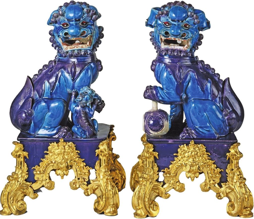 Chenets à décor de chiens de Fô en porcelaine bleu et aubergine de Chine, sur socles en bronze ciselé et doré, vers 1725. Livrés pour le château de Chantilly. Fontainebleau, musée national du château de Fontainebleau. © RMN-Grand Palais (château de Fontainebleau) / Martine Beck-Coppola