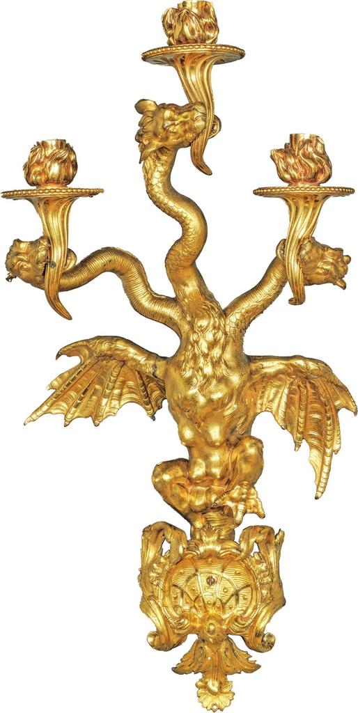 Quelques mois plus tard, en 1716, pour la chambre de la duchesse de Lorraine, sœur du Régent, au château de Lunéville, son architecte Germain Boffrand (1667-1754) choisit chez le très réputé « marchand, bronzier et doreur suivant la Cour », Jean-Baptiste Sautray, une paire de bras à trois branches à « teste d’un chien serbère (sic)7 » dont nous venons d’identifier le modèle8 dans leurs répétitions qui plurent à Calouste Gulbenkian et qui ont été récemment erronément datées « vers 17259 ».