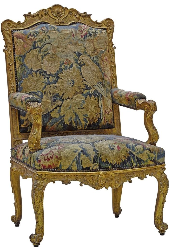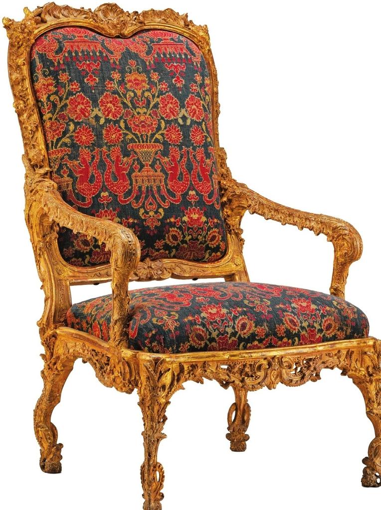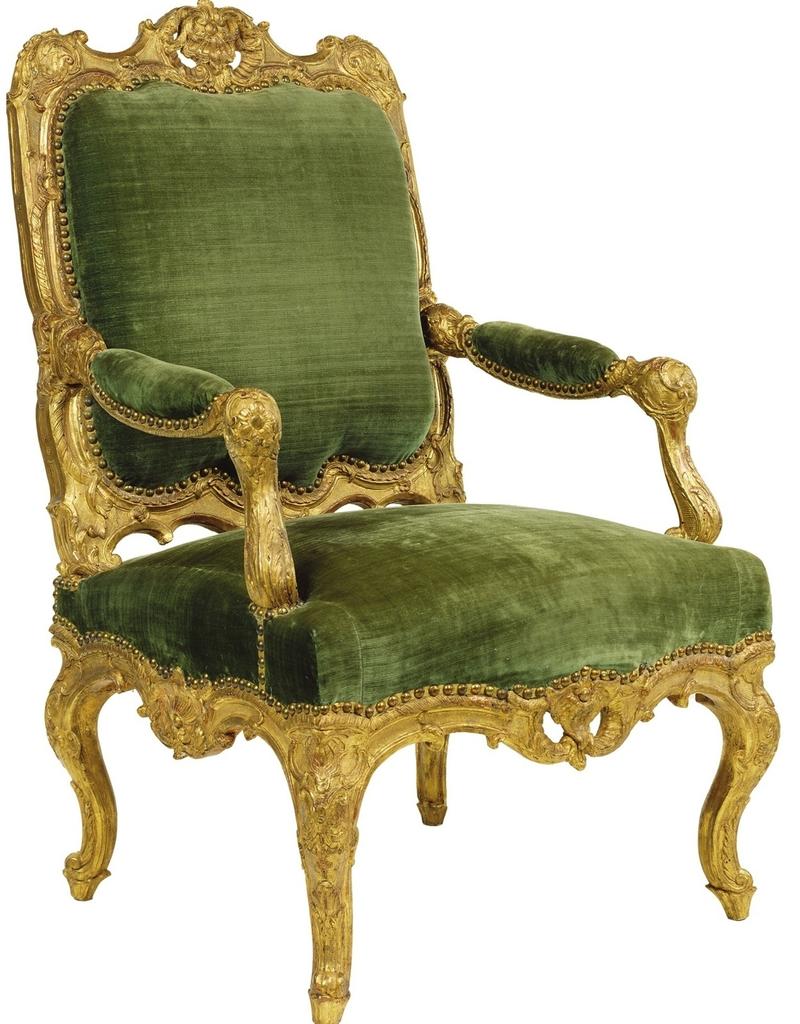 Dans le domaine du siège, ces années voient notamment la création de fauteuils larges, à l’assise basse, mais peut-être un peu trop basse pour les douairières qui tenaient salon, comme l’illustrent les différentes versions livrées par Jean-François de Troy (1679-1752) dans La lecture de Molière et dont un bel exemple venant de J. Pierpont Morgan est conservé au Metropolitan Museum of Art10 de New York. La virtuosité de la sculpture atteint parfois des sommets, comme en témoignent trois fauteuils, deux conservés au château de Versailles11 et le troisième au Metropolitan Museum of Art12. Les pieds, la ceinture, les supports d’accotoirs et les montants du dossier semblent être recouverts de végétation au naturel, tandis que les accotoirs sont ornés d’un double rang de lambrequins séparés par des joncs enrubannés. Presque partout dans les éléments feuillagés apparaît déjà une discrète asymétrie dans les motifs. Tant par la forme que par la sculpture, ces sièges appartiennent au style Régence, même si comme un certain nombre d’œuvres de cette période, ils semblent appartenir à une voie sans issue. L’évolution des sièges est particulièrement perceptible. Celui sur lequel est assis Charles de Saint-Albin, déjà relativement ancien en 1723, possède des consoles d’accotoirs droites tandis que sa partie haute est proche de celle d’un fauteuil conservé au château de Versailles. En revanche, ce dernier possède des consoles d’accotoirs galbées qui témoignent d’une évolution rapide du goût. La maturité de ce dernier peut se reconnaître dans un fauteuil conservé au J. Paul Getty Museum. Il marque un palier avant que les artistes décorateurs du bois ne cèdent aux sirènes de l’éxubérant style rocaille.